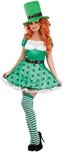 Disfraz clásico de Leprechaun para mujer de alta calidad: el traje contiene un vestido verde brillante con estampado de tréboles, calcetines a rayas hasta la rodilla y un gran sombrero verde.